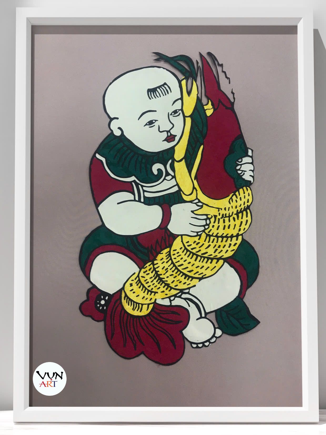 Tên sản phẩm: Tranh ghép lụa em bé ôm tôm – chuyển thể từ tranh dân gian Đông Hồ
